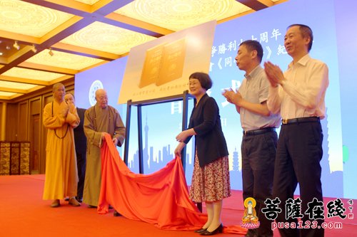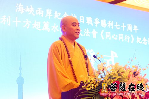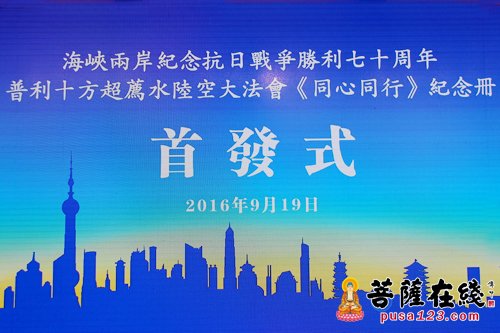 2015年9月19日至26日,上海佛教协会联合台湾新北市佛教会、金门县佛教会,在上海龙华古寺隆重启建以祭奠和超荐抗战英烈、罹难军民同胞为主旨的“海峡两岸纪念抗日战争胜利七十周年普利十方超荐水陆空大法会”。以佛教信仰者特有的方式,祭奠和超荐英勇献身的英烈和罹难军民同胞,表达两岸佛教四众弟子对祖国富强、世界和平的衷心祈愿。整场法会海众云集、千僧诵经、庄严如法、盛况空前。为如实记录这一殊胜难遇的历史时刻,上海市佛教协会在会长慧明大和尚的倡导和主持下,精心编辑出版了《同心同行——海峡两岸纪念抗日战争胜利七十周年普利十方超荐水陆空大法会》大型画册。2016年9月19日上午10时,沪台两地佛教界在静安寺隆重举行了《同心同行》画册首发仪式。