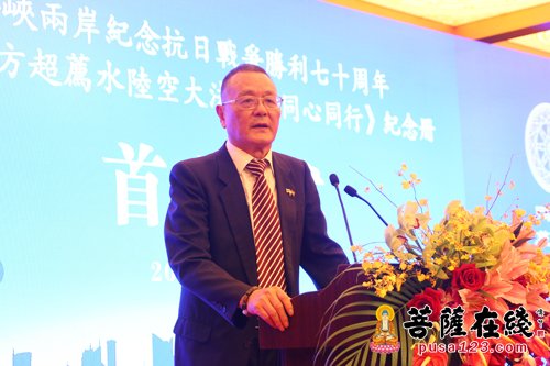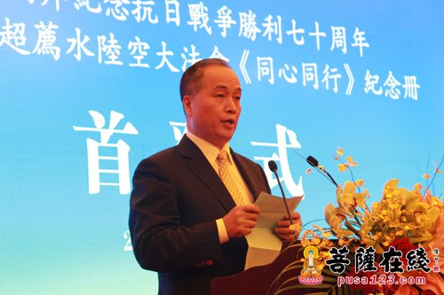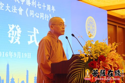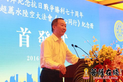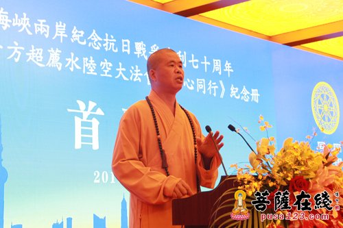 视频播放完毕后,上海市佛教协会会长慧明大和尚首先致辞,简要介绍了举办水陆法会的初衷、感想以及编辑画册的目的,他说:“‘后之视今,亦犹今之视昔’。我们编辑《同心同行》纪念册就是要告之现在及未来的两岸佛教四众弟子们,我们在佛陀的慈悲教导下,同一愿景,同一目标,同一祈愿,那就是两岸大众的福祉是我们共同的祝愿。我们将用纪念册形式再次展现那恢宏庄严的法会场面,将我们的感恩与感动、感激与感谢、感知与感受告知更多的人,和平的意义是多么重要与重大;将我们的交往与法谊、祈愿与祝祷、慈悲与宏愿告知更多的人,‘庄严国土,利乐有情’的佛教,用报恩的心态关心着每一位曾经逝去的生命,用慈悲的情怀关爱着社会与当下每一位生命的生存”。