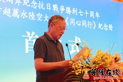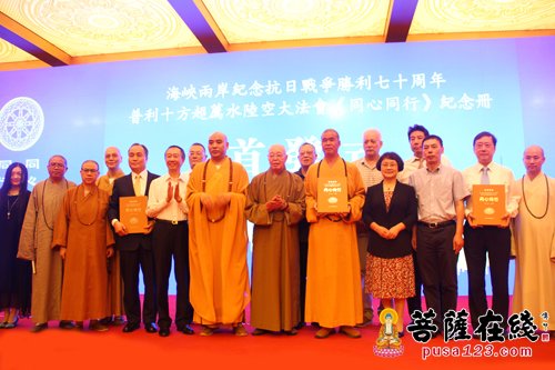 最后,画册主编、市佛教协会会长慧明大和尚代表编委会向台湾佛教界代表、抗战后裔代表、台湾各界人士代表现场赠书,以表达对他们为水陆法会的圆满顺遂所做贡献的钦佩和赞赏。至此,《同心同行——海峡两岸纪念抗日战争胜利七十周年普利十方超荐水陆空大法会》画册首发仪式”圆满结束。