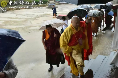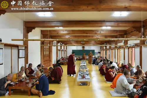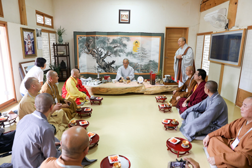 11日上午,面对风狂雨骤,代表团一行访问热情丝毫不减,按既定行程冒雨对韩国釜山著名的曹溪宗道场梵鱼寺进行了访问,受到梵鱼寺住持精禅法师的热情接待。在诵经礼佛仪式后,双方进行了友好座谈交流。中午,梵鱼寺按照独具特色的传统过堂方式,招待了代表团一行,给法师们留下了无比美好而深刻的印象。