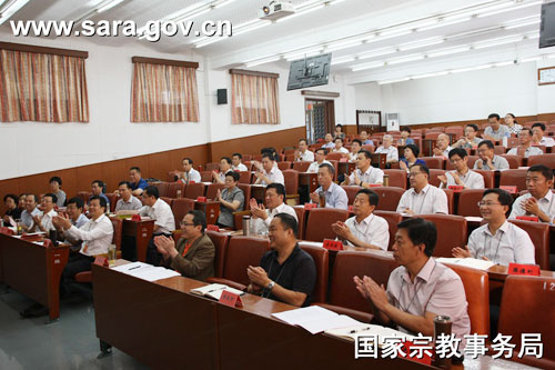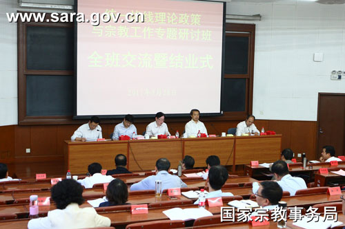 9月19日至28日,中央组织部、中央统战部、中央党校、国家宗教局在中央党校联合举办了地厅级干部统一战线理论政策与宗教工作专题研讨班,来自部分省、自治区、直辖市统一战线、宗教工作部门负责同志,市(地、州、盟)党委、政府分管统一战线和宗教工作的负责同志,共40人参加研讨班。这是中央统战工作会议、全国宗教工作会议以来,4部门首次举办以地厅级领导干部为对象的统一战线理论政策与宗教工作专题研讨班。中央组织部、中央统战部、中央党校、国家宗教局有关负责同志出席开班式和结业式,国家宗教局局长王作安在结业式上作总结讲话,国家宗教局副局长陈宗荣在开班式上作动员讲话。