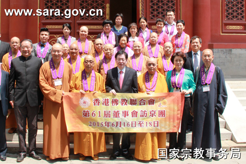 2015年6月17日上午,王作安局长会见了香港佛教联合会会长智慧长老率领的访问团一行。